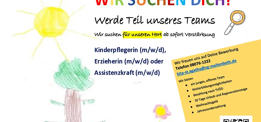 Wir suchen Verstärkung für unseren Hort. Wir bieten: ein junges offenes TeamWeiterbildungsmöglichkeitenBezahlung nach TVÖD30 Tage Urlaub +…