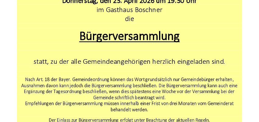 Am 23.04.2026 findet im Gasthaus Boschner die Bürgerversammlung statt. Wir laden alle Bürgerinnen und Bürger herzlich ein.