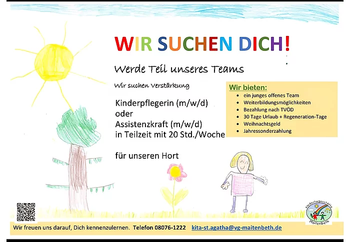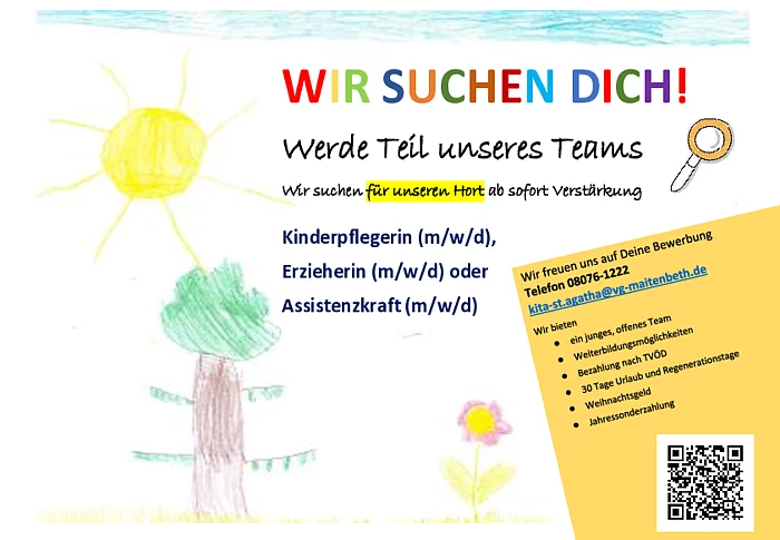 Wir suchen Verstärkung für unseren Hort. Wir bieten: ein junges offenes TeamWeiterbildungsmöglichkeitenBezahlung nach TVÖD30 Tage Urlaub + Regeneration-TageWeihnachtsgeldJahressonderzahlung