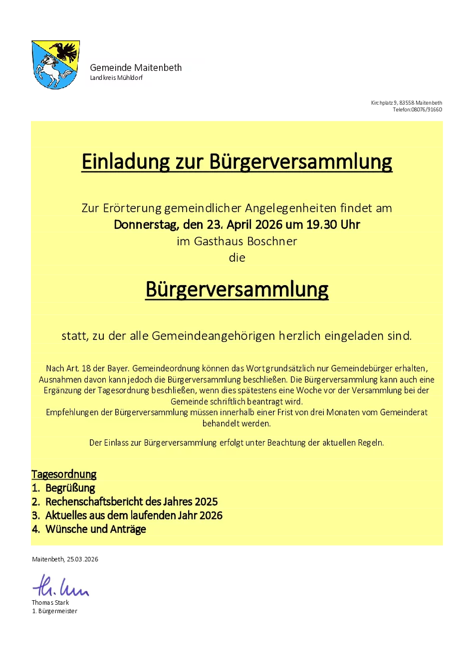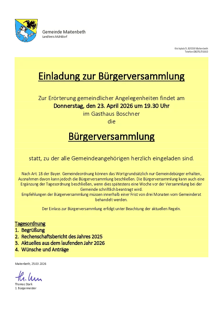 Am 23.04.2026 findet im Gasthaus Boschner die Bürgerversammlung statt.